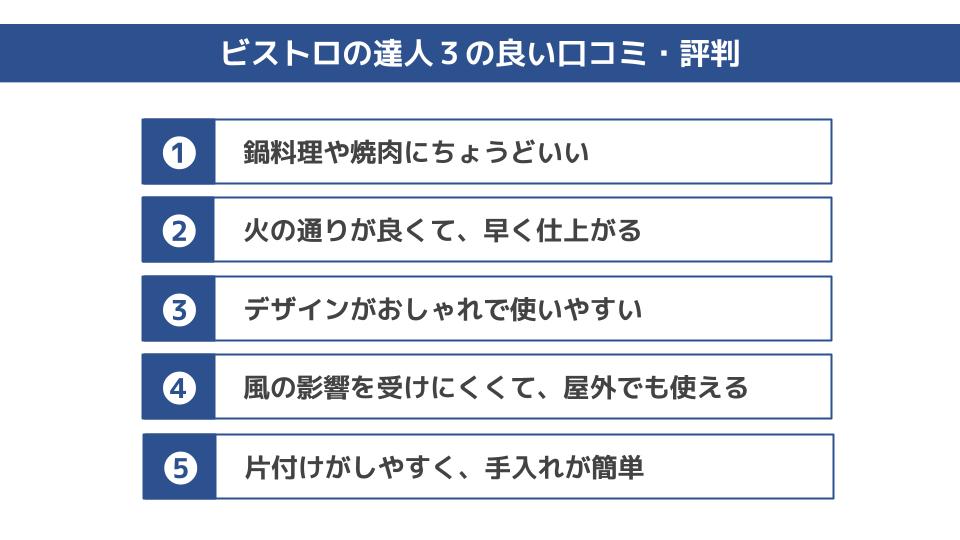 この口コミから、ビストロの達人3が鍋料理や焼肉に最適なカセットコンロであることが伝わってきますね。