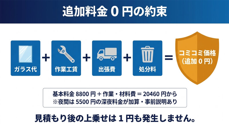 | 割れた破片の掃除 | プロが徹底回収・処分まで無料 | 自分で掃除、または別途有料 |