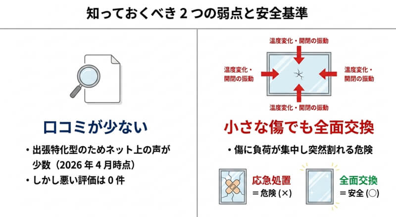 | 提案の幅 | 防犯・断熱など最新ガラスも対応 | 修理のみで提案がない場合も |