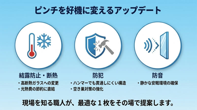 メリット④:防犯・防音・結露対策など、機能性ガラスへの交換も提案してもらえる