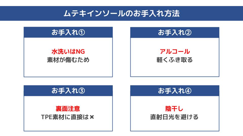 以上の4つのポイントを守ることで、ムテキインソールを清潔に保ちながら長く快適に使うことができますよ。